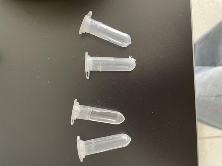 實驗開始客戶使用自配的離心管進行研磨,兩個樣品,另外添加兩個凈信生產的加厚研磨管進行四角配平,時間30s,功率調到4檔??蛻舻碾x心管很薄,立馬被擊碎,凈信加厚研磨管沒有破裂但也出現(xiàn)了較嚴重磨損。
