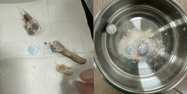 骨骼處理:將一整根的骨頭用鉗子處理成小塊,確保每塊骨頭大小適中,便于研磨。