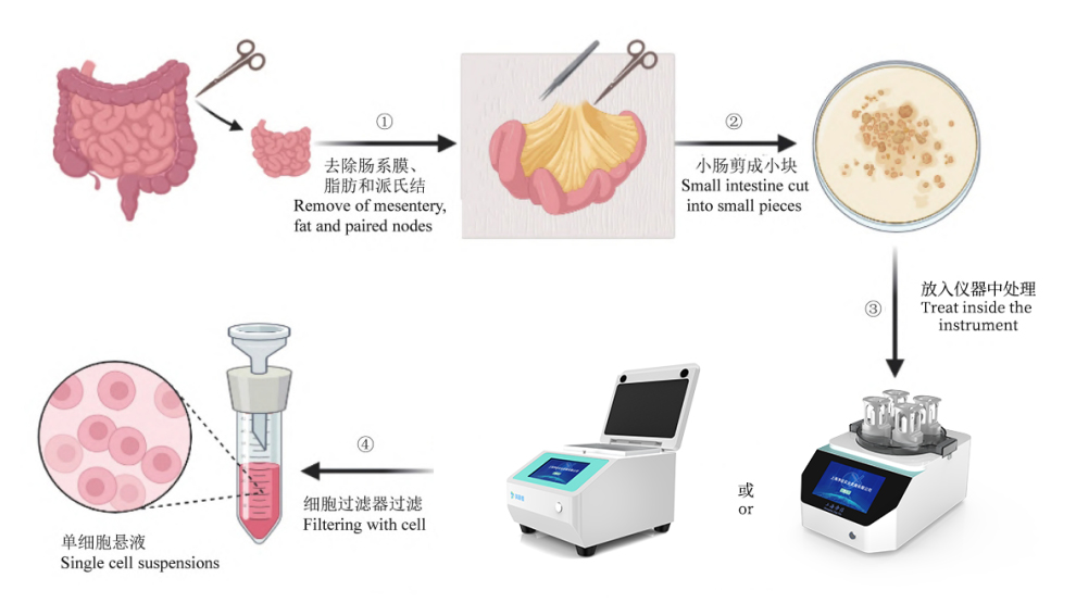 將消化管放入單細胞胞懸液制備儀上,選擇對應的腸道程序,程序結束后,儀器自動停止,然后加入終止液,離心,棄掉上清,用培養(yǎng)基重懸即可得到小腸固有層單細胞懸液。(如下圖)