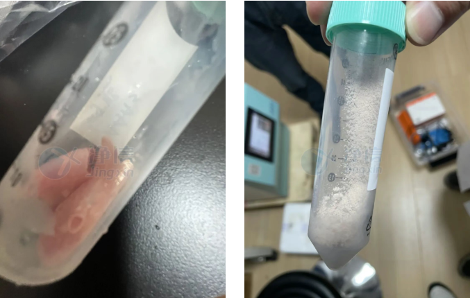 上圖為1分鐘的研磨效果,已經(jīng)完全研磨完成。效果非常好,冷凍研磨儀一次可以研磨2個樣品,大大提高了之前用手磨的效率和效果,所以人工研磨特別不方便,經(jīng)過多次了解和對比所以老師選用凈信冷凍研磨儀代替人工處理。效率高,效果好。解決了老師的研磨問題。