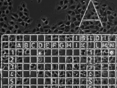Locating cells or cell clusters, e.g., transfected cells for clone picking