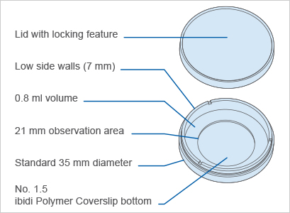 The μ-Dish 35 mm, low comes with a thin ibidi Polymer Coverslip Bottom that has the highest optical quality (comparable to glass) and is ideally suitable for high-resolution microscopy. It is also available as μ-Dish 35 mm, low Glass Bottom with a #1.5H Glass Coverslip Bottom for TIRF or single molecule microscopy.