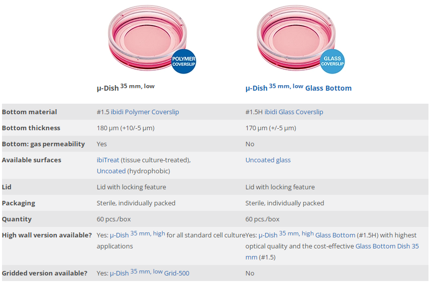 Comparison of the ibidi Dishes 35 mm, low
