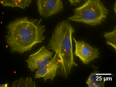 Fluorescence microscopy of HuH7 cells after mRNA transfection with eGFP (green). Actin cytoskeleton (Phalloidin, yellow), nuclei (DAPI, blue), mRNA (FISH,Quasar 670, red), 40x objective lens, oil immersion.