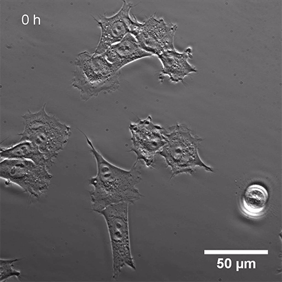 Timelapse phase contrast microscopy of rat fibroblast cells using the μ-Slide 8 Well high ibiTreat in combination with the ibidi Heating System and the ibidi Gas Incubation System. 63x objective lens, oil immersion, 3 min image intervals for 23 hours.