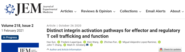 2020年10月27日,加州大學圣地亞哥分校醫(yī)學院,聯(lián)合法國圖盧茲大學和康涅狄格大學衛(wèi)生院的科學家在Journal of Experimental Medicine(JEM) 上在線發(fā)表了題為Distinct Integrin Activation Pathways for Effector and Regulatory T cell Trafficking and Function的工作(來自作者為孫昊博士)。