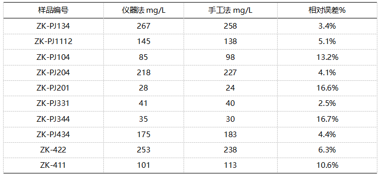 分別取10個水樣,按照HJ828-2017標(biāo)準(zhǔn)的操作步驟,進(jìn)行手工操作和上機(jī)操作,根據(jù)所得的實(shí)驗(yàn)數(shù)據(jù)進(jìn)行比較,計算兩者的偏差百分比%