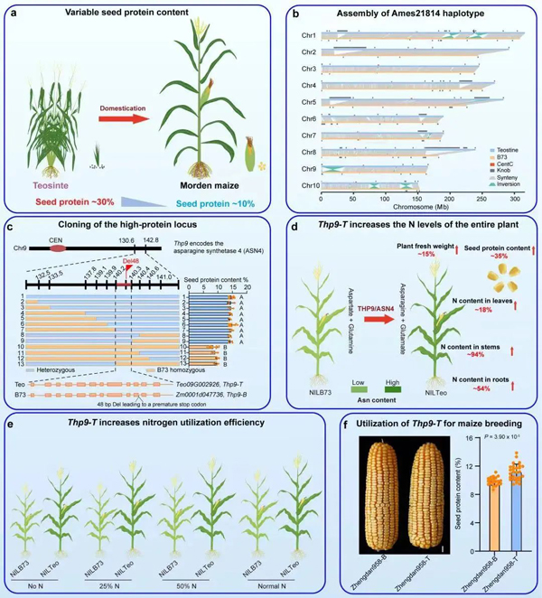 經(jīng)過10年堅持不懈的努力,科研人員終于從野生玉米中克隆了控制玉米高蛋白品質(zhì)形成和氮素高效利用的關(guān)鍵變異基因Teosinte High Protein 9 (THP9)。