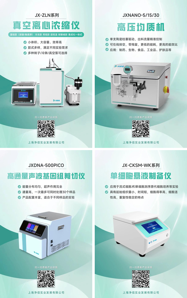 十幾年來凈信不斷進(jìn)行自我創(chuàng)新與突破。通過持續(xù)優(yōu)化產(chǎn)品性能和提升服務(wù)質(zhì)量,我們實(shí)現(xiàn)了從單一產(chǎn)品到多元化發(fā)展的轉(zhuǎn)變,拓展了市場影響力。上海凈信科研者系列產(chǎn)品也在上市推廣中!真空離心濃縮儀、高壓均質(zhì)機(jī)、單細(xì)胞懸液儀、高通量聲波基因組剪切儀。
