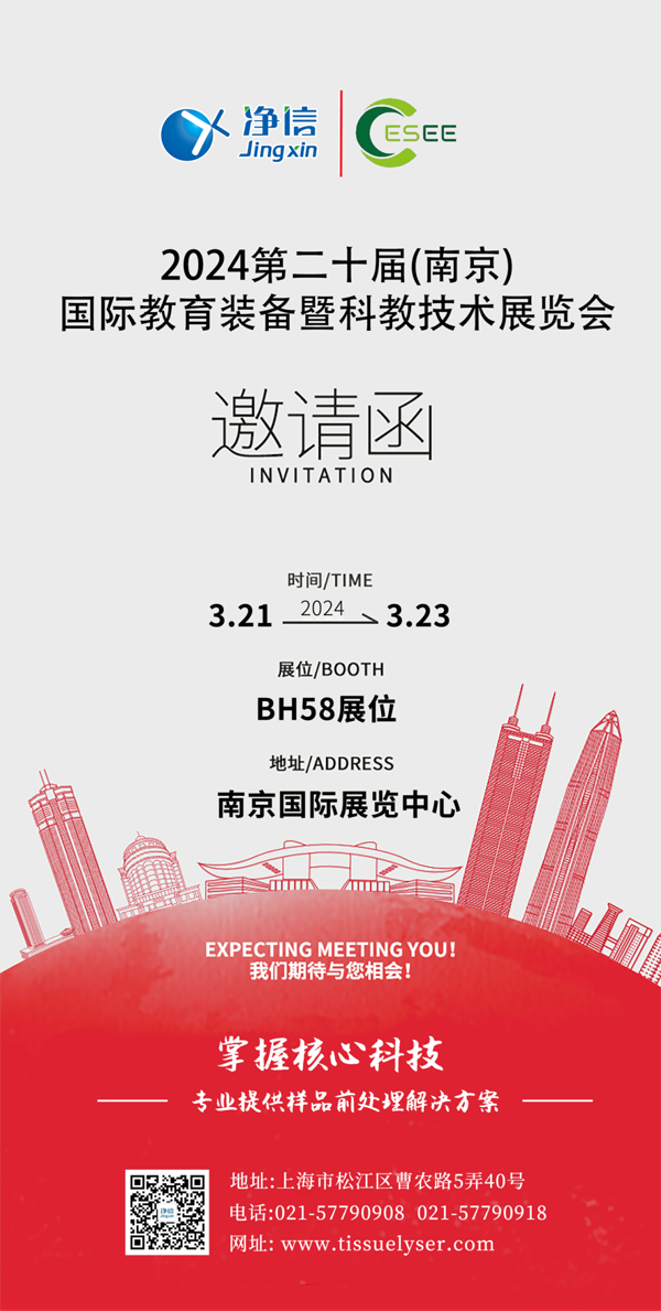2024年3月21日至3月23日,第二十屆中國南京國際教育裝備暨科教技術(shù)展覽會,將會在南京國際展覽中心舉辦。上海凈信將攜多款新產(chǎn)品出席亮相,包括凈信科研者系列新品、超聲波設(shè)備、研磨設(shè)備等等。誠摯地邀請您前來BH58展位暢談商機,共話樣品前處理的技術(shù)和應用。