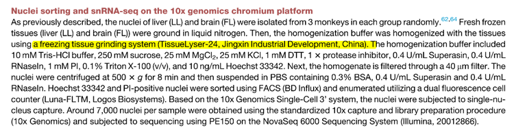Tissuelyser-24L發(fā)揮了不可或缺的作用。研究團隊利用這種凈信的組織研磨儀,從雄性獼猴的肝臟和大腦中提取細(xì)胞核,為后續(xù)的單細(xì)胞RNA測序(snRNA-seq)分析奠定了基礎(chǔ)。通過精確的細(xì)胞核分離和高質(zhì)量的樣本制備,研究人員能夠深入探究二甲雙胍對細(xì)胞老化的具體影響,從而揭示了其在延緩衰老中的分子機制。