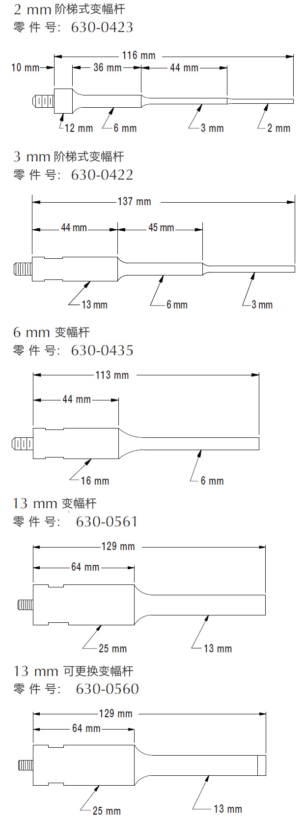 注:所有探頭和可更換探頭均由高等級鈦合金Ti-6Al-4V制成,可高壓滅菌。由于超聲波探頭調(diào)試到共振狀態(tài),其長度可能會因鈦合金的彈性模量變化而略有變化。