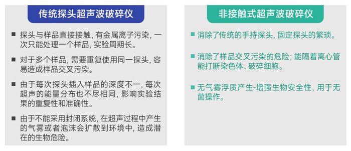 非接觸式樣品可在密閉容器下進行破碎,不產(chǎn)生感染性飛霧,超聲探頭與樣品不接觸,避免交叉污染。對于每天要處理多個樣品或者貴重樣品的實驗室,非接觸超聲波DNA破碎儀具有處理高通量,樣本低損耗無交叉污染等優(yōu)勢。逐漸成為ChIP(染色質(zhì)免疫共沉淀)和DNA剪切研究平臺不可缺少的標準化工具。